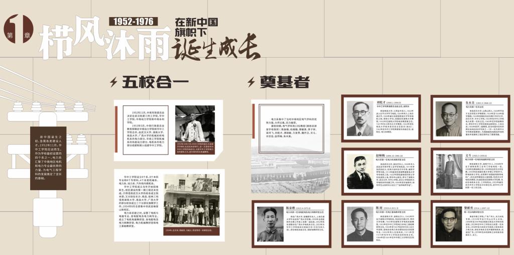 长廊从“学院电气工程学科发展历程概览图”为引导,表列了历任院长(系主任)、历任党委书记(党总支书记),介绍了学院“栉风沐雨,在新中国旗帜下诞生成长”“奋发图强,在改革开放中蓬勃发展”“与时俱进,在世界大势中争创一流”的发展历史。