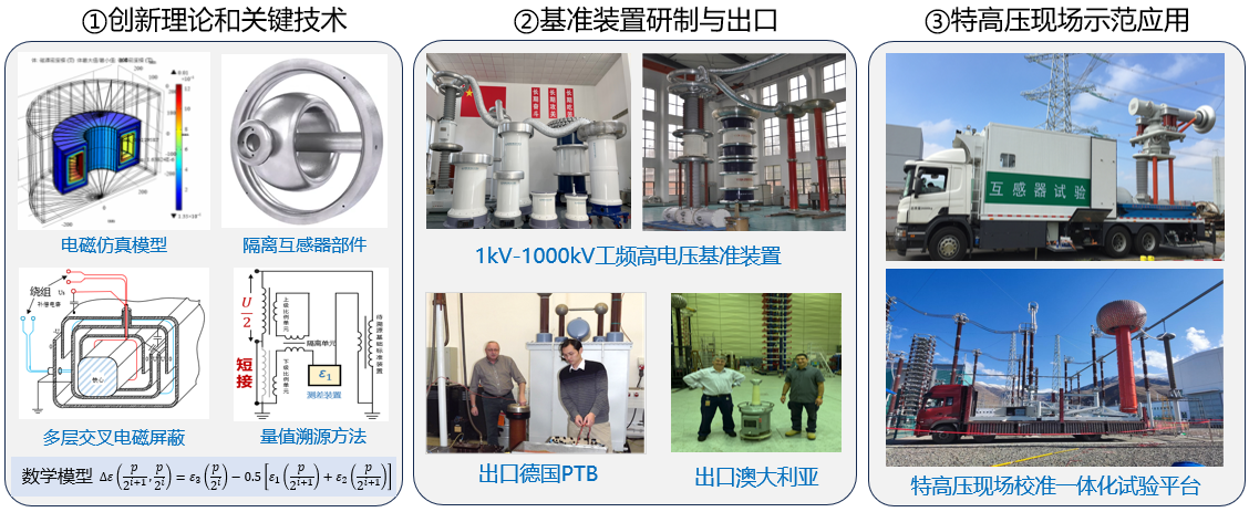 在高电压大电流基标准装置研制方面,提出高电位跨越精密电压测量技术,研发了全屏蔽高压隔离型电压互感器,获2022年中国专利奖金奖。建立国家工频高电压计量基准,研制出1kV~1000kV工频高电压基准装置,测量不确定度达1×10-5。创建1000kV现场高可靠性一体化校准系统,准确度0.05%,解决电力量测设备运行与量值统一难题,成果获2018年国家科学技术进步二等奖。研制1200kV、200kA冲击电压电流国家标准,成果获2024年中国电工技术学会科技进步一等奖。