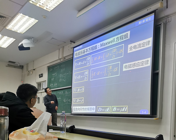 电气1909至1910班《电磁场与波》的授课老师夏胜国老师新春第一课就和学生们聊起学过的各门专业基础课,唠起了“家常”。在西十二楼S11教室,夏老师为同学们带来了新年祝福,他时不时生动的举例爽朗的大笑迅速拉近了与同学们之间的距离。“咱们这堂课难度较大,大家除了平时认真听课,课下也要认真花时间。”夏老师授课以板书为主,这样能更好地让学生集中精神,参与公式的推导和记忆。看着满黑板的公式,要想听懂真得打起十二分精神呢!