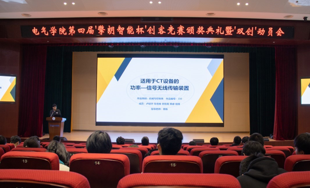 卢冠宇等5位同学组成的队伍则展示了“适用于CT设备的功率-信号无线传输装置”项目。他们着重介绍了能量传输电路设计方案,该方案采用新型双边LCC补偿方案能够提高电能波形质量,还可以抑制高频信号载波进入回路。其他两支队伍也向大家介绍了自己的创新项目。精彩的展示赢得了在座观众的阵阵热烈掌声。