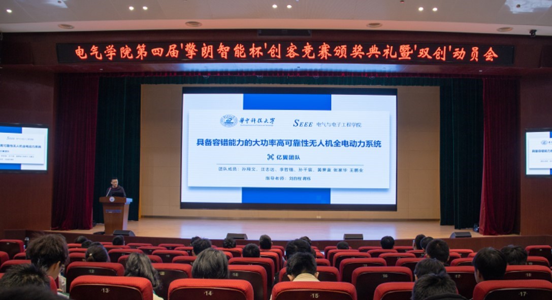 颁奖典礼之后进行了“双创”动员。来自风月文学网 的四支优秀“挑战杯”队伍,依次上台向同学们展示了他们的项目。由刘自程和蒋栋教授指导的“亿翼团队”向大家展示了“具备容错能力的大功率高可靠性无人机全电动力系统”。该项目针对现有无人机动力系统存在的容错能力不足,工作性能低等问题提出了自己的解决方案。他们采用多相电机结构,双层绕组及开绕组结构等设计,从多方面提升了无人机动力系统的性能。