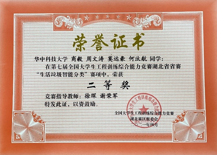 实验中心徐琛、谢荣军老师指导的商毅团队的生活垃圾智能分类赛项,荣获湖北赛区二等奖。