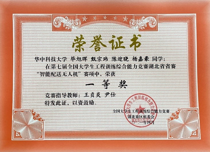 实验中心王贞炎、尹仕老师指导的毕旭晖团队的智能配送无人机赛项,荣获湖北赛区一等奖。