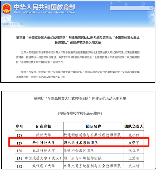 2025年9月5日,教育部公布第四批“全国高校黄大年式教师团队”创建示范活动入围名单,我院文劲宇教授为团队负责人的“强电磁技术教师团队”成功入选。