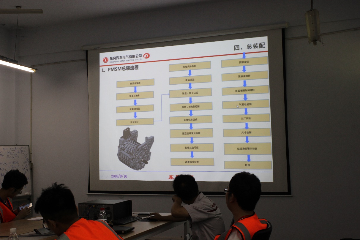 8月16日上午,蔡甲春首先为大家讲解了电动汽车电机的生产过程,而后带领同学们参观了电动汽车电机装配的全流程。首先是作为最开始的工艺绝缘插槽,第二步是机器机械化的的绕线,其次就是为了让上一步松散的铜线变得十分的紧密从而防止了出现问题的浸漆工作,到这里定子的生产过程就暂时告一段落,接下来的几步是转子的生产工艺:第一步是为了让转子能和定子一起转动需要的磁性而给转子充磁,充磁又分为前充磁和后充磁,下一步是为了让转子转动的时候不由于生产工艺的原因导致的不均匀的误差,使得转子出现震动而调整转子动平衡,把以上步骤做完后就可以开始装配定子和转子了。装配完了以后还需要检查气密性,这个气密性是要防止冷却电机的油泄露出去造成严重后果。最后就是出厂测试,检查一些其他方面可能出现的问题。