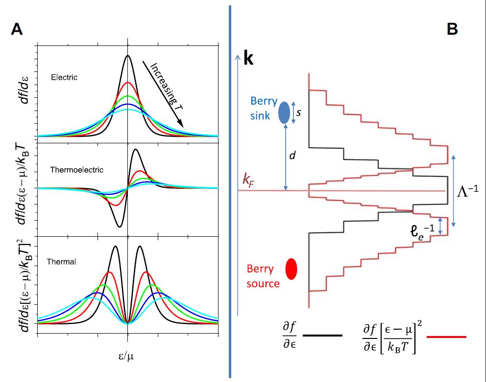 图2 A.输运各系数的积分因子B.热导率和电导率对于贝里曲率的积分示意图