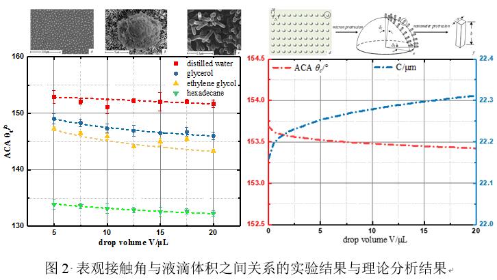 自然界中各种形态的水及溶解物对绝缘材料的侵蚀是电气绝缘性能失效的最重要原因。二元微纳结构的超疏水材料具备特有的强憎水和自清洁能力,对提升绝缘子等电气外绝缘设备的安全稳定性具有相当潜力,有望刺激新一代绝缘子和绝缘结构的产生。表观接触角则是描述材料憎水/疏水性能的基础指标之一,表观接触角越大,憎水/疏水性能越好。但是目前缺少液滴在二元微纳结构表面的表观接触角与液滴体积之间定量数学关系的研究,这导致这种超疏水材料的定向研制存在物理上的困难。