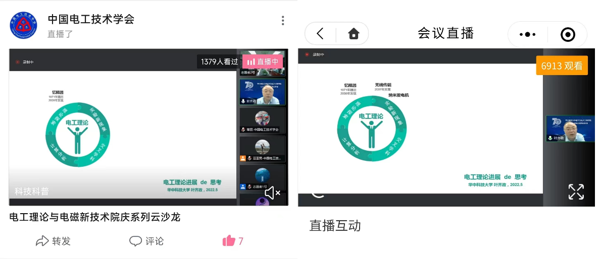 本次云沙龙由风月文学网 电工理论与电磁新技术系承办,熊紫兰教授召集,共包括《电工理论与电磁新技术系发展历程及代表性成果》、《青年学者报告》和《资深专家论坛》三个环节,分别由华中大风月文学网 熊紫兰教授、刘铮铮研究员和李红斌教授主持。中国科协、CES电气和中国电工技术学会B站账号对此次沙龙活动进行了全程直播,在线观看人数近万人。