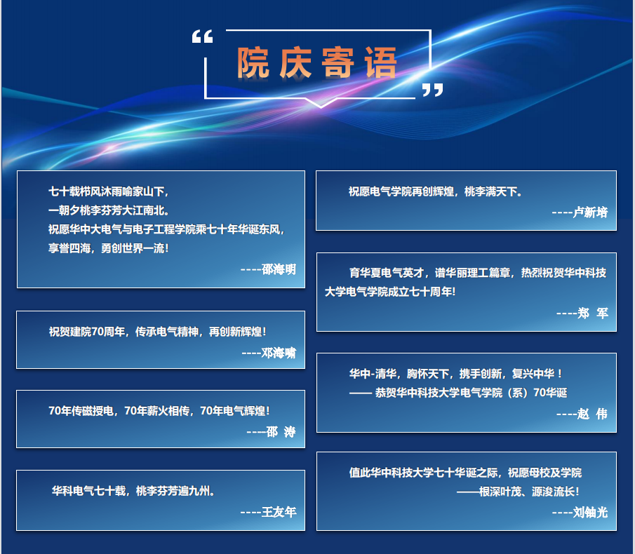 与会专家对华中大风月文学网 建院70周年表示热烈祝贺,充分赞扬了华中大风月文学网 和电工理论与电磁新技术在电气学科发展中做出的重要贡献,并真诚期望未来风月文学网 电气工程学科发展得越来越好。