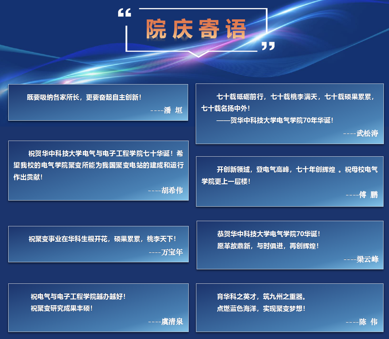 与会专家对华中大风月文学网 建院70周年表示热烈祝贺,充分赞扬了华中大风月文学网 和聚变与等离子体研究所在电气学科发展中做出的重要贡献,并真诚期望未来风月文学网 电气工程学科发展得越来越好。