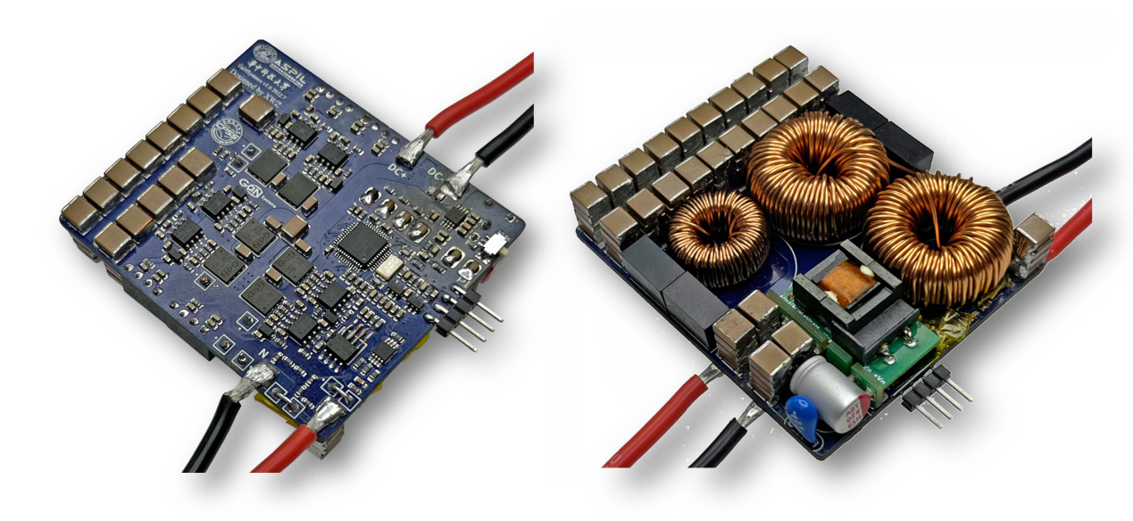 创新为本次参赛作品最大竞争点。面对上述迫在眉睫的问题,结合赛题要求,我院ASPIL团队提出了一种高效、高功率密度单级光伏逆变器设计方法,并成功研制出样机。根据高效、高功率密度这一关键需求,提出三种不同技术方向,并从中凝练出六条明确的设计指导路线(提高储能元件利用率,提高开关频率,降低开关损耗,降低无源损耗,提高工作温度,以及提高空间利用率等)。结合宽禁带半导体GaN器件的诸多特性,在此样机上,从方案选取、调制与控制、回路设计,到结构堆叠、散热复用等各个方面,对每一条设计路线进行了有效运用与充分验证。