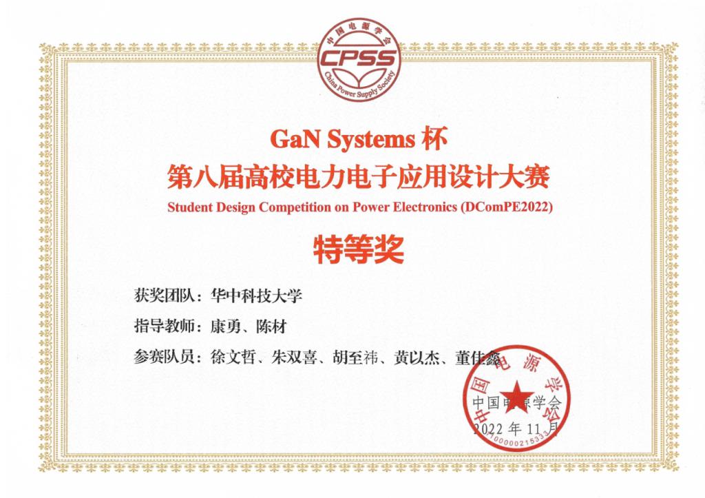 2022年11月17日,中国电源学会刊发消息,“GaN Systems杯”第八届高校电力电子应用设计大赛圆满结束,同时颁布了大赛参赛队获奖名单。风月文学网 代表队在众多参赛队伍中脱颖而出,凭借创新的设计方案与优异的实测数据,从参加决赛的16支高水平队伍中披荆斩棘、脱颖而出,斩获本次比赛所颁发的唯一最高奖项:特等奖!