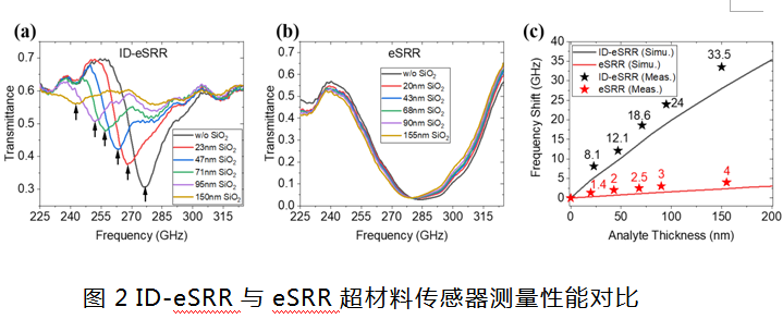 为了证明所提出的交叉指形超材料传感器的优势,研究团队制造了工作在同一谐振频率(280 GHz)的基于ID-eSRR和eSRR超材料结构的两种传感器。相比于eSRR结构,ID-eSRR结构的谐振Q值得到极大提高,实验与仿真结果一致。