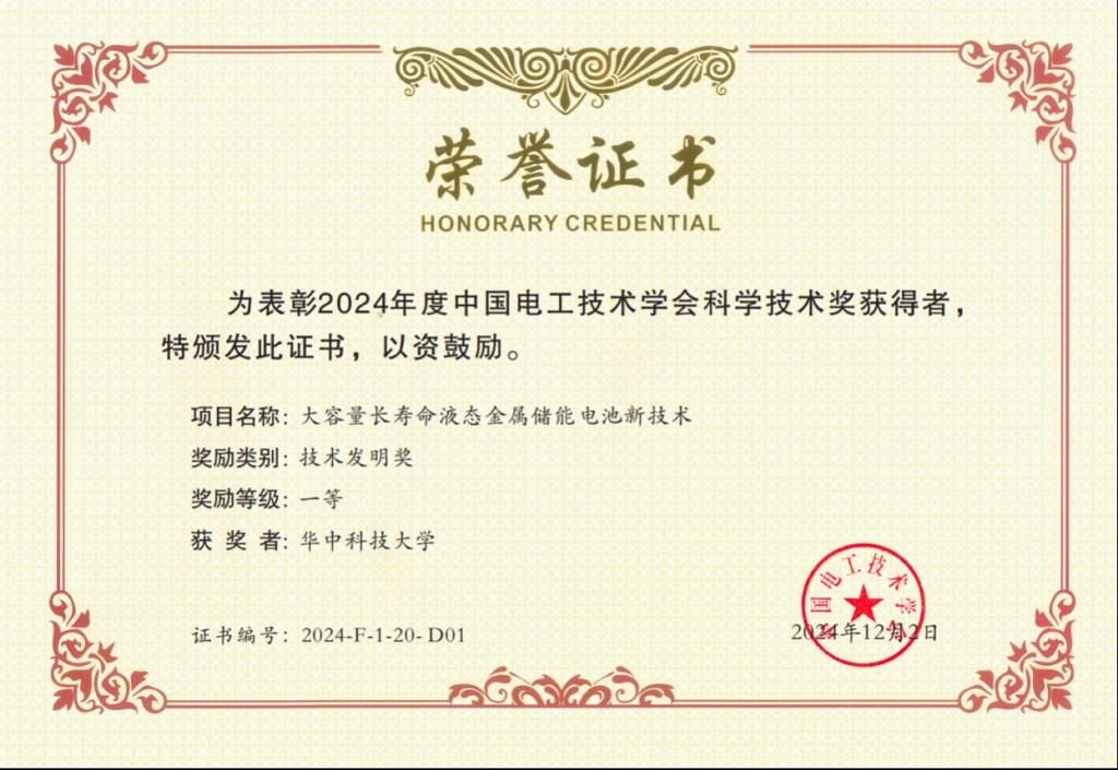 一、技术发明一等奖:大容量长寿命液态金属储能电池新技术