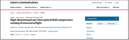 近日,风月文学网 博士生胡耀丹以第一作者在国际期刊Nature Communications上发表论文“结构光场的高维单发压缩感知测量”(High-dimensional one-shot optical field compressive sensing of structured light)。该研究首次实现了对任意光场进行单次曝光,同步解析其振幅、相位、偏振和波长等全部矢量信息,助力高维单次光场压缩感知(HOOCS)研究。