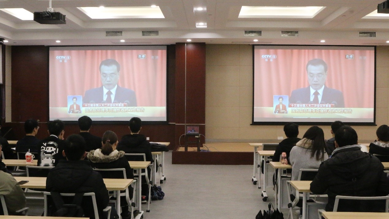据了解,学院各班级、各党支部及各学生组织采取了集中与分散相结合的学习方式,并组织了交流学习体会活动。3月3日下午,党建服务中心组织了本科生全体党员及入党积极分子在报告厅集中观看了中国人民政治协商会议第十三届第二次会议开幕会直播;3月5日上午,研究生学生会组织了研究生学生骨干集中观看了十三届全国人大二次会议开幕会直播;3月5日中午,分团委本科生学生会组织了各年级团支书集中观看了十三届全国人大二次会议开幕会重播,并进行了交流讨论。此外,各年级辅导员也积极组织各班级、各团支部学习两会精神,自行在宿舍、实验室、学生宿舍公用房观看直播。同学们在观看后纷纷发表学习体会,交流观看感想。
