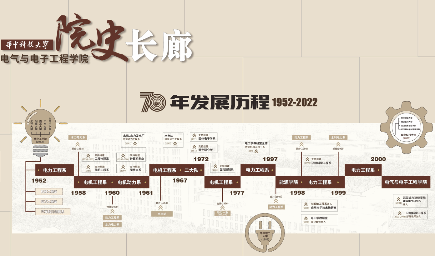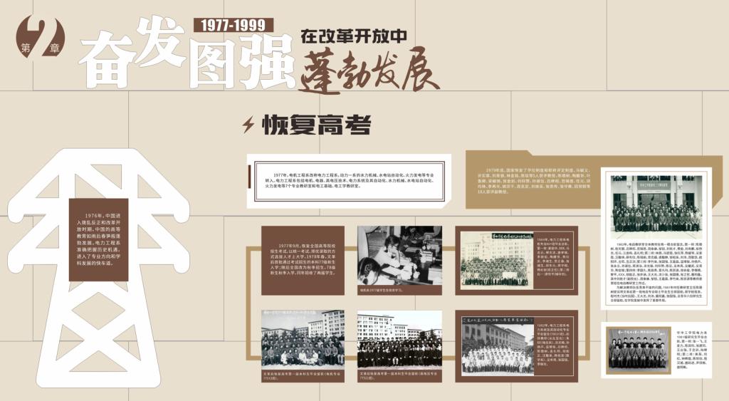 长廊从“学院电气工程学科发展历程概览图”为引导,表列了历任院长(系主任)、历任党委书记(党总支书记),介绍了学院“栉风沐雨,在新中国旗帜下诞生成长”“奋发图强,在改革开放中蓬勃发展”“与时俱进,在世界大势中争创一流”的发展历史。