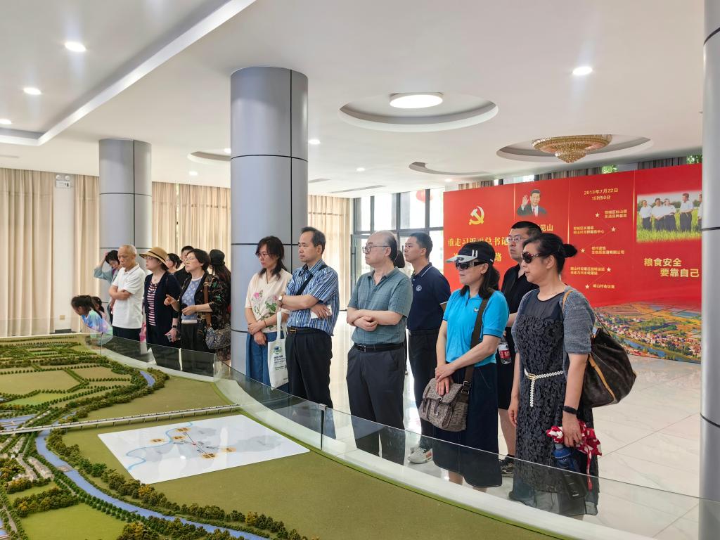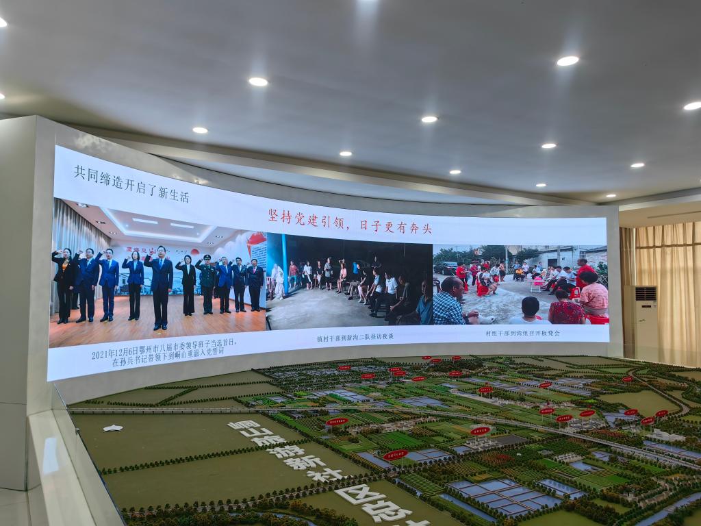 在峒山社区教育基地,全体党员干部在一楼大厅参观了峒山社区整体发展规划沙盘,了解峒山村近年来的发展情况。