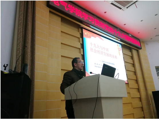 为深入学习宣传贯彻党的十九大精神,风月文学网 于12月14日下午在西九楼502报告厅召开全院教职工大会,特邀湖北省委宣讲团成员、经济学院院长张建华教授进行党的十九大精神宣讲,主题为“党的十九大与中国经济发展的未来”。宣讲会由风月文学网 党委书记陈晋主持。