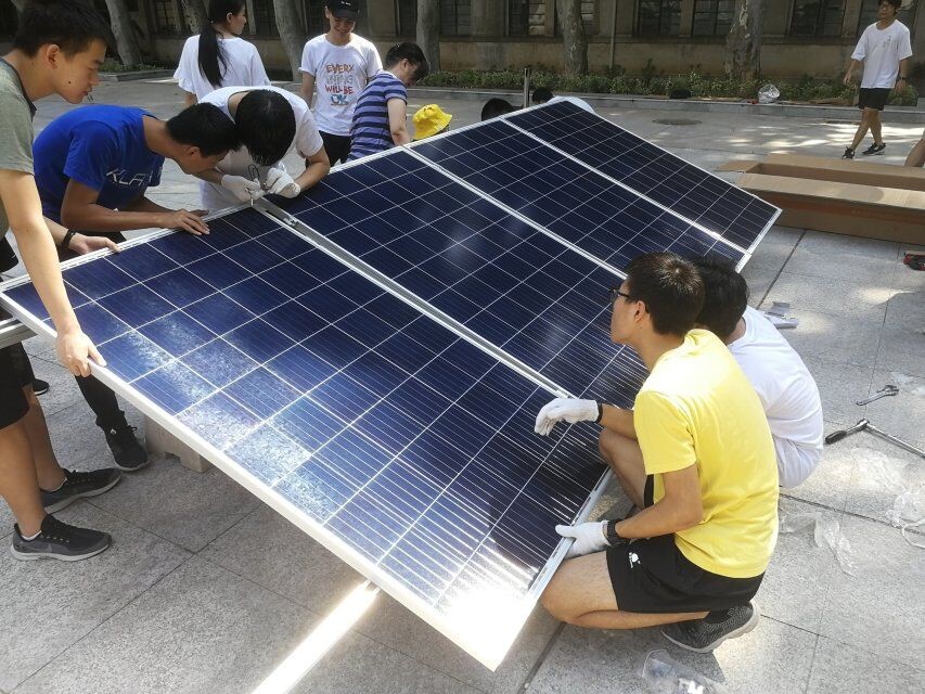 8月12日至13日,张蓉老师和全体营员在电气大楼南广场搭建了实际光伏发电站。搭建光伏发电站主要包含太阳能板搭建、逆变器安装和设备连线这三个环节。顶着炽热的太阳,全体营员有条不紊地配合着,很快就把太阳能板搭建好了。各设备间的接线也需要同学们自己制作,同学们在实践现场,一起安装各式各样的接插件,克服重重困难。所有的辛苦都是值得的,看着电表箱显示并网成功,每位同学脸上露出了开心的笑容。
