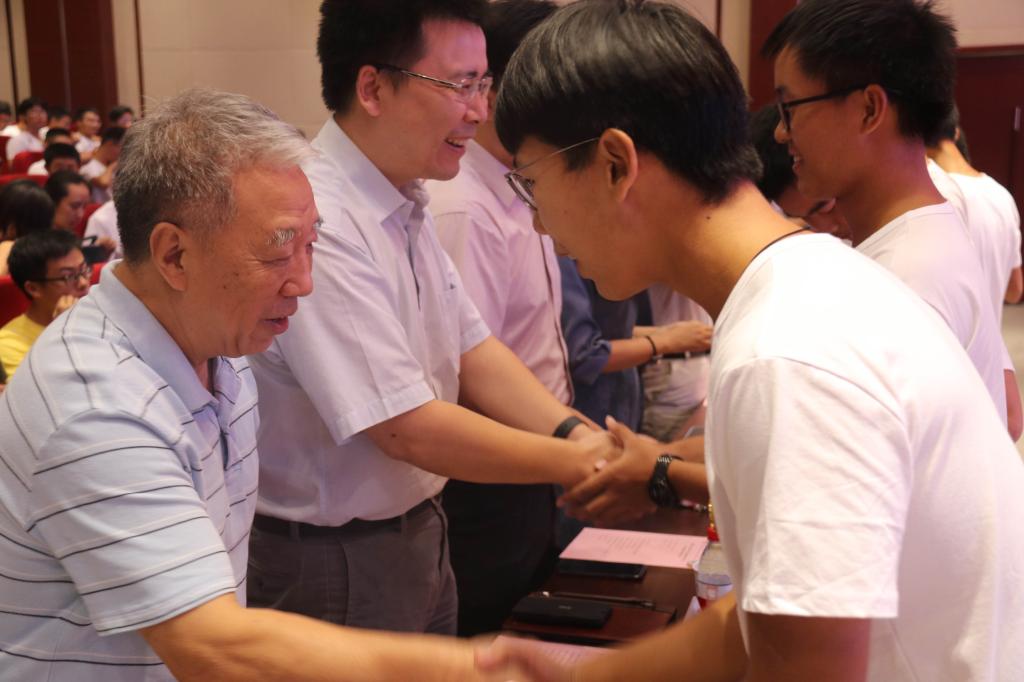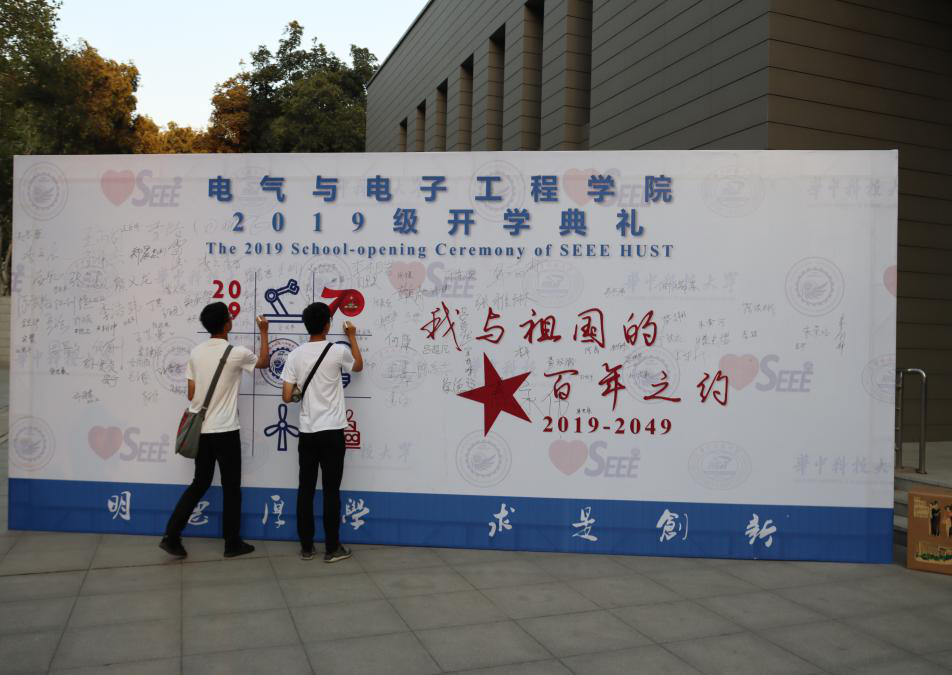 视频结束后,开学典礼正式开始。全体师生起立,奏唱国歌,激昂的乐曲声为开学典礼拉开了序幕。专属于电气学子的院徽被发放到同学们手中,学生代表上台,由特邀嘉宾为他们佩戴院徽。同时台下同学也自行佩戴上院徽。新生代表卓越1901班周尾良同学作为新生代表发言,提出了自己未来四年的规划以及与祖国同成长共进步的期望。连续三年荣获国家奖学金,已保研清大学的老生代表卓越1601班何长军,以“大学,请你勇敢些”为主题,总结了自己大学三年保持优秀的原因以及对19级新生的具体建议。教师代表应用电子系的孙伟老师表达出教师服务引导学生的真心。随后,为向中华人民共和国成立七十周年献礼,各班依次起立,齐诵本班口号并奏唱献礼歌曲。歌曲完毕,全体新生进行宣誓,表达对未来四年学习生活的坚定决心。
