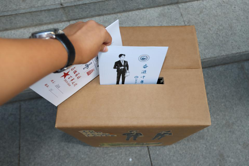 三个精美的信箱立在签名板旁,分别标有“青葱四年”“奋进十年”“我与祖国的百年之约”。这三个主题分别对应同学们早早准备好的三封信,写给未来的自己与祖国。同学们排好队,庄重地将手中的三封信分别投入对应的信箱。