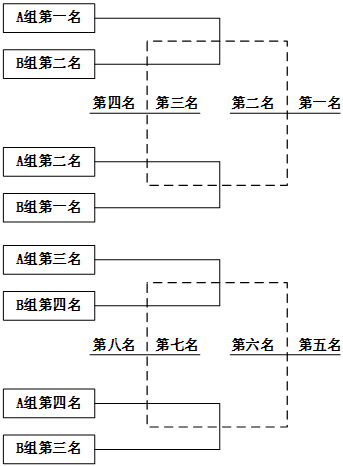 A组和B组分别进行循环积分赛。所有循环赛结束后,A组积分前两名和B组积分前两名共四个队伍进行半决赛和决赛,决出本届“凯默杯”师生羽毛球团体赛冠军、亚军、季军和殿军;A组积分第三、四名和B组积分第三、四名共四个队伍交叉进行比赛,决出本届“凯默杯”师生羽毛球团体赛第五名、第六名、第七名和第八名。具体如下图所示。