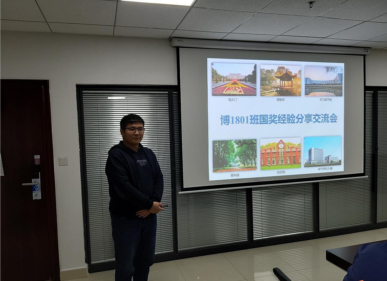 为了提高同学们的科研热情,弘扬身边榜样精神,增强班级文化建设,加深班级凝聚力,电气博1801班于11月18日晚在新电气大楼918会议室开展了国奖获得者科研经验分享暨学术交流活动。班级学习委员、本年度博士国家奖学金获得者杨赛昭同学作为分享人参与了本次活动,就自己的科研工作经验与感受与大家进行了交流分享,班长王义凯主持了讨论会,班级全体成员参加了本次活动。
