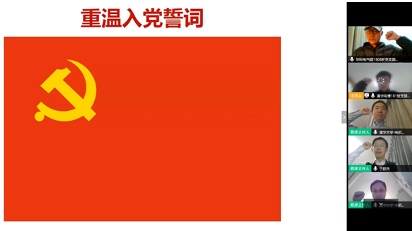 清华大学电博181班党支部的学生党员们从文献检索、研究方法、时间管理和状态管理四个方面分享了居家学习科研的心得体会。清华大学电机系党委副书记郑泽东勉励大家充分利用这段时间,扎实做好科研工作,为返校后的学习科研打下坚实基础。接着,与会党员们打开摄像头,原地起立并举起右拳,面对屏幕中央的党旗庄严宣誓,重温入党誓词,接受心灵洗礼,铭记庄严承诺。