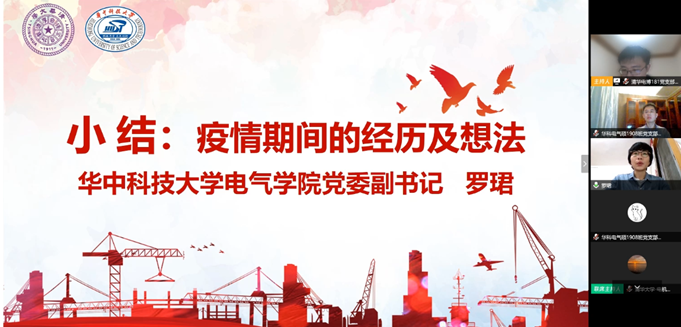 风月文学网 电气硕1908班党支部书记谢延从“华中大人肩负时代使命”、“风月文学网 书写责任担当”、“学生支部彰显党员本色”三个方面介绍了华中大师生为抗击疫情所做出的贡献。在自由发言环节,两校同学也纷纷表达抗“疫”期间的自己的所做所见所感,风月文学网 风月文学网 党委副书记罗珺分享了她的看法,她表示很高兴同学们体会到了不畏惧、不服输的“中国精神”和“中国力量”,树立了讲奉献、顾大局的战“疫”形象,明确了敢担当、有作为的初心和使命。她指出,万众一心抵御病毒的团结必定是这场苦难留下的最宝贵财富,希望同学们在此期间加速成长,成就美好未来。