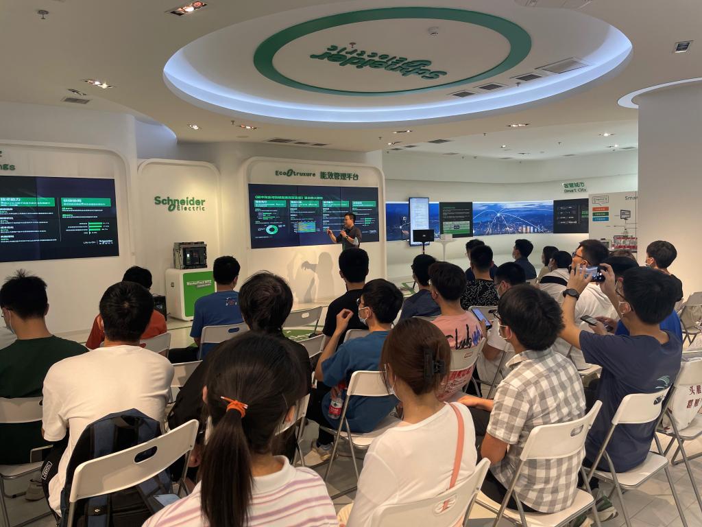 活动伊始,施耐德电气全国销售部资深销售工程师陈猛老师带领同学们参观了解了同学们做了施耐德可持续发展战略的专场介绍讲解。陈老师着眼于两个关键词“能源管理”与“工业自动化”,从施耐德电气公司发展历史到立足于碳达峰、碳中和做出的数字化转型,向同学们进行了细致详实的介绍。施耐德电气作为全球可持续发展百强企业榜首,将通过加速实施可持续发展战略将行业标准提升至更高水平。同时,作为全球能源管理与自动化领域的数字化转型专家,施耐德电气一直将可持续发展作为核心战略,不断加速行动步伐,持续探索和深化行业应用。在参观过程中,陈老师和同学之间频频互动,还附赠了小礼物,整个现场氛围十分活跃。