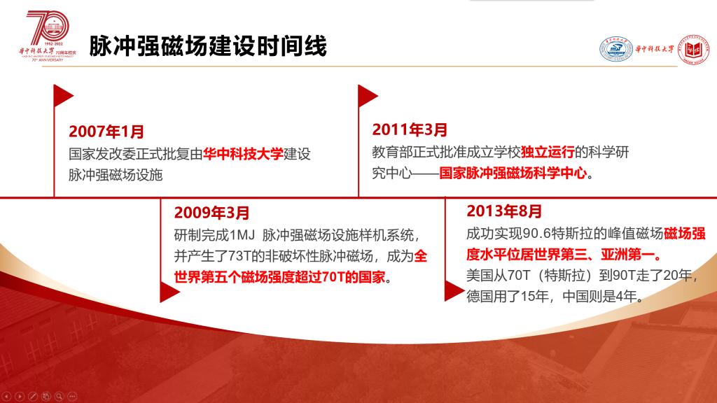 楼奕轩首先从“场”的概念出发,介绍了建设脉冲强磁场的重要科学意义。紧接着,她结合潘院院士首提建设强磁场建议(2001)、李亮教授全职回国组建团队(2007),到国家发改委正式批复建设设施(2007)、教育部正式批准成立国家脉冲强磁场科学中心(2011),再到成功实现世界第三、亚洲第一的峰值磁场强度水平(2013)、荣获国家科技进步一等奖(2019),分享了强磁场人同心奋斗、强磁场从无到有到世界领先的故事。最后,楼奕轩引用习近平总书记重要讲话:“自力更生是中华民族自立于世界民族之林的奋斗基点,自主创新是我们攀登世界科技高峰的必由之路”,勉励全体同学将习近平总书记的重要嘱托转化为干事创业的行动。