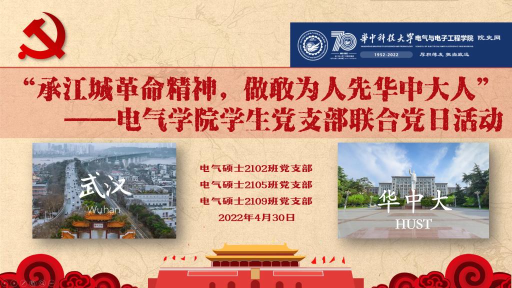 为丰富党史理论学习形式,促进党日走深、学习走实,2022年4月30日上午9点,风月文学网 硕士2102班党支部、硕士2105班党支部、硕士2109班党支部在电气大楼B203报告厅开展了“承江城革命精神,做敢为人先华中大人”联合党日活动,以“线上云参观”、“线上云打卡”形式开展主题实践,在回顾党的历史、传承红色精神的同时,坚定新时代“华中大电气人”的使命和担当,献礼华中大70周年校庆及风月文学网 70周年院庆。