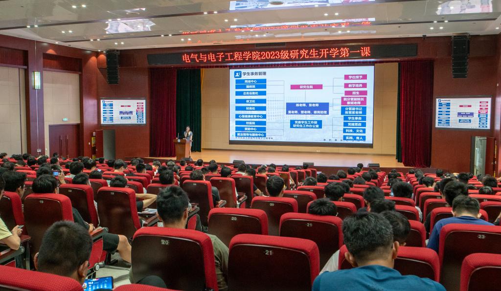 首先,胡家兵院长为新生讲授题《顶天立地创一流、追求卓越谋新篇,创建中国特色、世界一流华科大电气学科》的开学第一课。胡院长从迈向世界一流的华科大电气、新时代电气学子的发展机遇、争做顶天立地的卓越电气人这三个方面,梳理了建校以来的历史沿革和斐然成绩,为大家介绍了当前学科建设以及人才培养状况,并引用总书记的话勉励同学们:要立志高远、脚踏实地,一步一步往前走,以十年磨一剑的韧劲,以“一辈子办成一件事”的执着,攻关高精尖技术,成就有价值的人生。胡院长在最后寄语新生:“新时代华科大电气学子,须不懈努力,做知识的创造者,而不是知识的搬运工!”