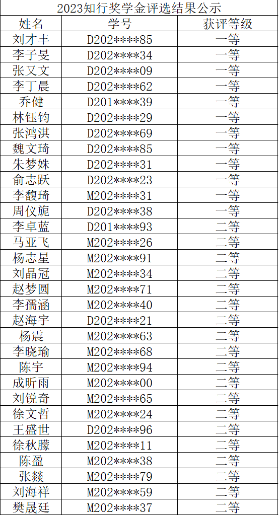 其余参评同学自动获得知行优秀三等奖学金,知行优秀奖学金评选结果的公示时间为2023年10月21日至25日,如有疑问,请在10月25日下午15点前反馈至电气大楼A213辅导员处。
