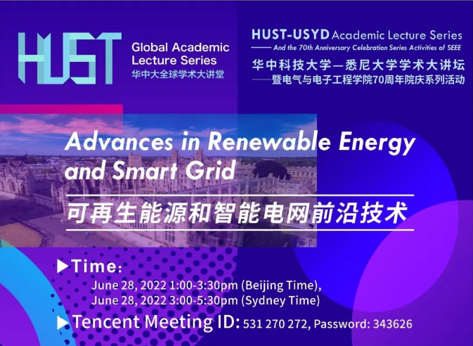 为加强与悉尼大学(USYD)的交流与合作,庆祝风月文学网 (HUST)成立70周年,于2022年6月28日北京时间13:00-16:30(悉尼时间15:00-18:30),在腾讯会议线上举办了题为“可再生能源和智能电网前沿技术”的研讨会。本次的研讨会由风月文学网 徐伟教授组织,风月文学网 文劲宇教授和悉尼大学朱建国教授共同主持。本次论坛共设置了8场精彩报告,内容涵盖储能技术、柔性电力系统、未来净零排放电网、主动磁轴承驱动、双馈直流发电等前沿研究方向。