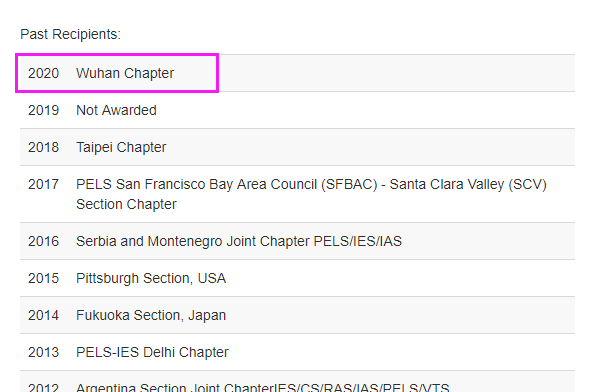IEEE是国际上最大的学术组织之一,涵盖电气与电子工程的各个领域。IEEE设有多个专业分会,PELS是IEEE下最大的专业分会之一,也是电力电子领域最重要的国际学术组织。IEEE PELS在全球有170多个地区分会,其中在中国大陆一共有六个地区分会。地区分会是IEEE PELS在各个地区的分支机构,负责当地的会员组织和学术活动。每年IEEE PELS会评选不超过1个最佳地区分会,作为对于该年度表现优异的分会的奖励。历届最佳分会公布在IEEE PELS的主页上。武汉分会是2020年获奖的地区分会。