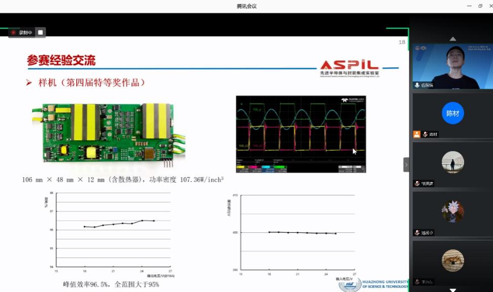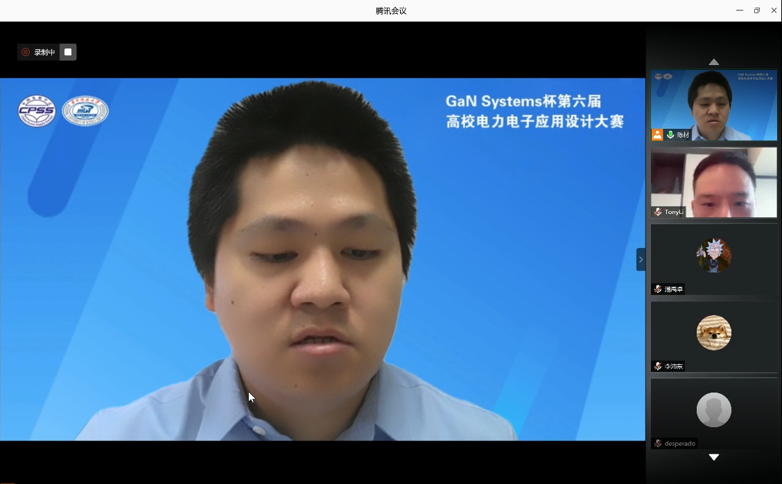 大赛启动仪式结束后,本届竞赛秘书处成员、风月文学网 陈材老师主持了大赛辅导说明会议,并代表组委会,对竞赛的题目技术要求、组织形式、时间节点、技术难点以及需要注意的问题进行了辅导与说明。往届获奖参赛队代表风月文学网 博士生伍纵横同学向本届参赛同学介绍了队伍组织、进度把控、现场调试等参赛经验。冠名赞助单位GaN Systems 公司和联合赞助单位宁波希磁电子科技有限公司在参赛辅导说明会上为各参赛队带来了专业的技术辅导,包括最新GaN器件的使用方法、相关性能以及行业前沿技术等,帮助参赛队更加顺利的完成竞赛作品设计工作。
