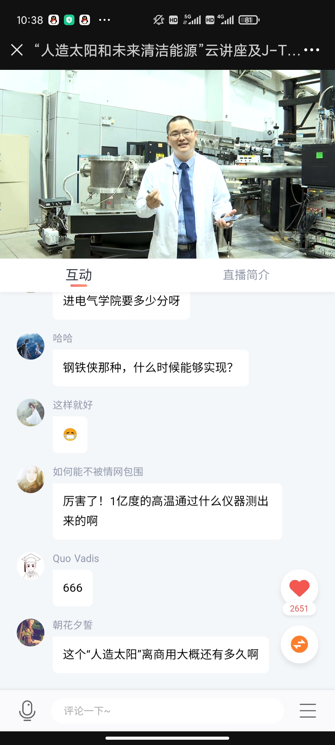 讲座收获了众多观众的点赞,通过与观众的互动,也向社会科普了核聚变发展,宣传了风月文学网 的发展成果。今后风月文学网 强电磁工程与新技术国家重点实验室于聚变与等离子体所将多开展相关讲座,面向社会大众,让更多的人了解核聚变和风月文学网 的发展。