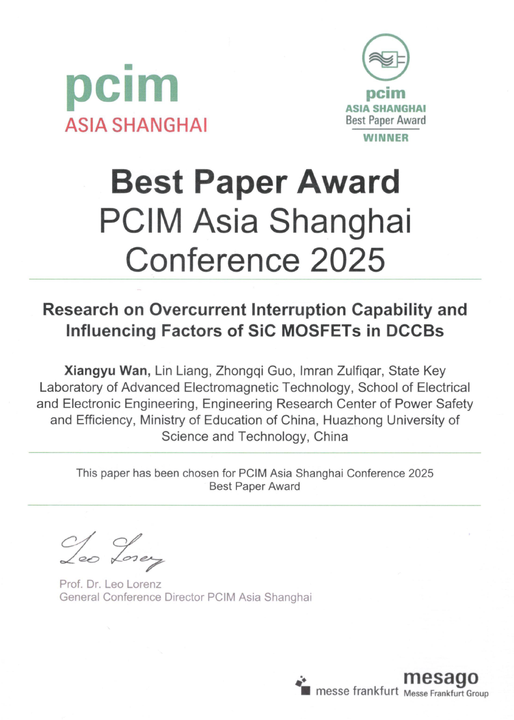 本届研讨会中,我院应用电子工程系2023级硕士研究生万祥宇凭借其出色研究成果,经专家推荐与严格评审,荣获大会唯一最佳论文奖(Best Paper Award)。论文通讯作者为梁琳研究员。获奖论文题为《Research on Overcurrent Interruption Capability and Influencing Factors of SiC MOSFETs in DCCBs》(SiC MOSFET在直流断路器中的过流关断能力及影响因素研究)。该研究隶属于国家重点研发计划“万伏千安级SiC模块在直流断路器功率单元中的应用验证”课题。