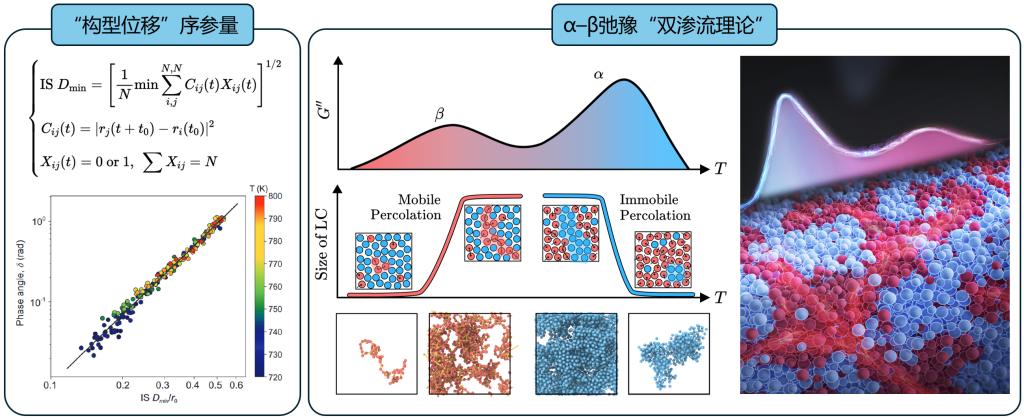 玻璃转变过程包括主导流动的α弛豫和反映局域原子运动的β弛豫,两者时间尺度差异极大,但长期缺乏统一理论描述。为了解决这一问题,团队提出了“构型位移”序参量,首次实现了对α与β弛豫的统一描述。该序参量在不同近似下可自然导出均方根位移(RMSD)和Parisi重叠函数,为玻璃转变提供了统一理论框架。此外,团队提出的“α–β双渗流理论”,揭示了液体冷却过程中不可移动粒子的渗流与玻璃态可移动粒子的渗流转变,成功统一了玻璃态物质的两种关键动力学过程。这一系列理论不依赖具体材料结构,适用于多种非晶物质体系,推动了玻璃转变研究的进展。