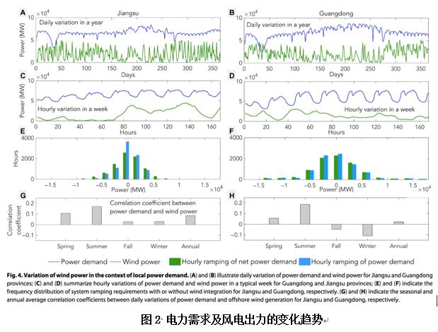 海上风电的系统接入特性。该文对海上风电的出力特性与接入特性进行了初步分析。图2总结了广东和江苏在不同时间尺度下电力需求及风电出力的变化。结果表明,海上风电季节变化较小,夏季平均容量因数近30%,远高于陆上风电;江苏和广东夏季海上风电具有明显的正调峰特性。