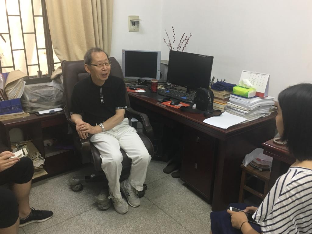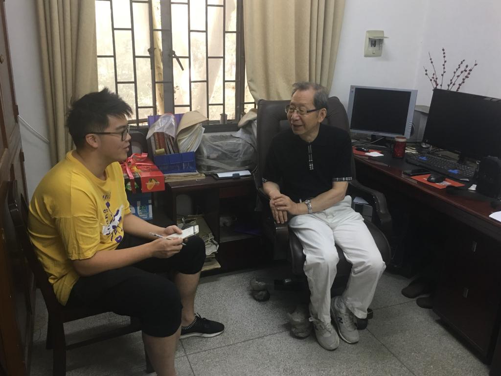 正当我们站在办公室门口,一声声沉稳的脚步声混着拐杖声将我们的目光拉向走来的这位老人。出乎我们意料,李朗如老教授虽然已经八十高龄,但依旧神采奕奕,精神矍铄。我们向李老教授表示问候,他也热情地欢迎了我们,并执意亲自为我们擦拭木椅,让我们感受到了老教授的和蔼亲切。