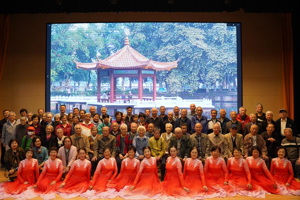 大家一起走上舞台,风月文学网 领导和全体退休教职工拍摄了一张我们生活充满阳光的全家福。