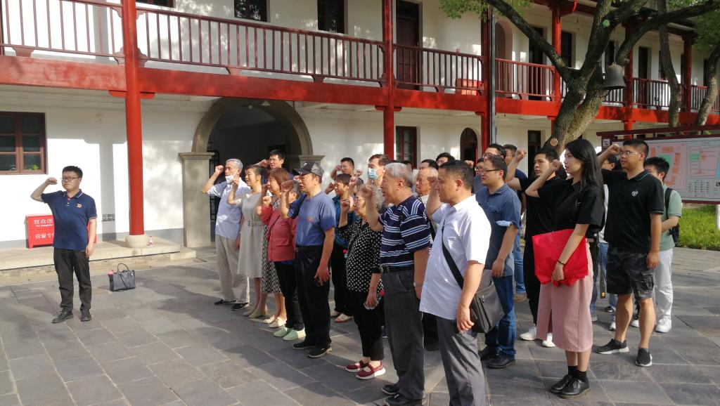 在五大会址,全体参加主题党日活动的党员面对党旗,庄严地举起右手重温了入党誓词。