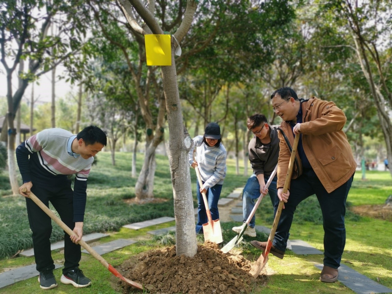 春风十里芙蓉面,暖阳印绿琴台路。植树活动现场热火朝天,各位老师分工协作,挥锹铲土,扶苗填坑,忙得不亦乐乎。有老师回忆起小时候下地松土的经验,有老师分享自己养花的心得,现场更有专业园林工作者指导如何种树,在七嘴八舌七手八脚的热闹氛围中,一棵棵小树被松土浇水。植下一棵小树苗,挂上一个认养牌,也就种下了弘扬绿色理念的责任,种下了对勃勃生命力的向往。