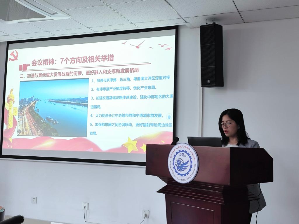 支部成员陈亚妮以“强化政治担当,增强积极主动”为主题讲授党课,带领大家深入学习领会习近平总书记在新时代推动中部地区崛起座谈会上的重要讲话精神,号召大家自觉服务高水平科技自立自强,为推进中部地区崛起的国家战略贡献华科大电气力量。支部成员张孟围绕《中国共产党党员网络行为规定》,以生动的事例教育引导同志们走好网上群众路线,规范自身网络行为。